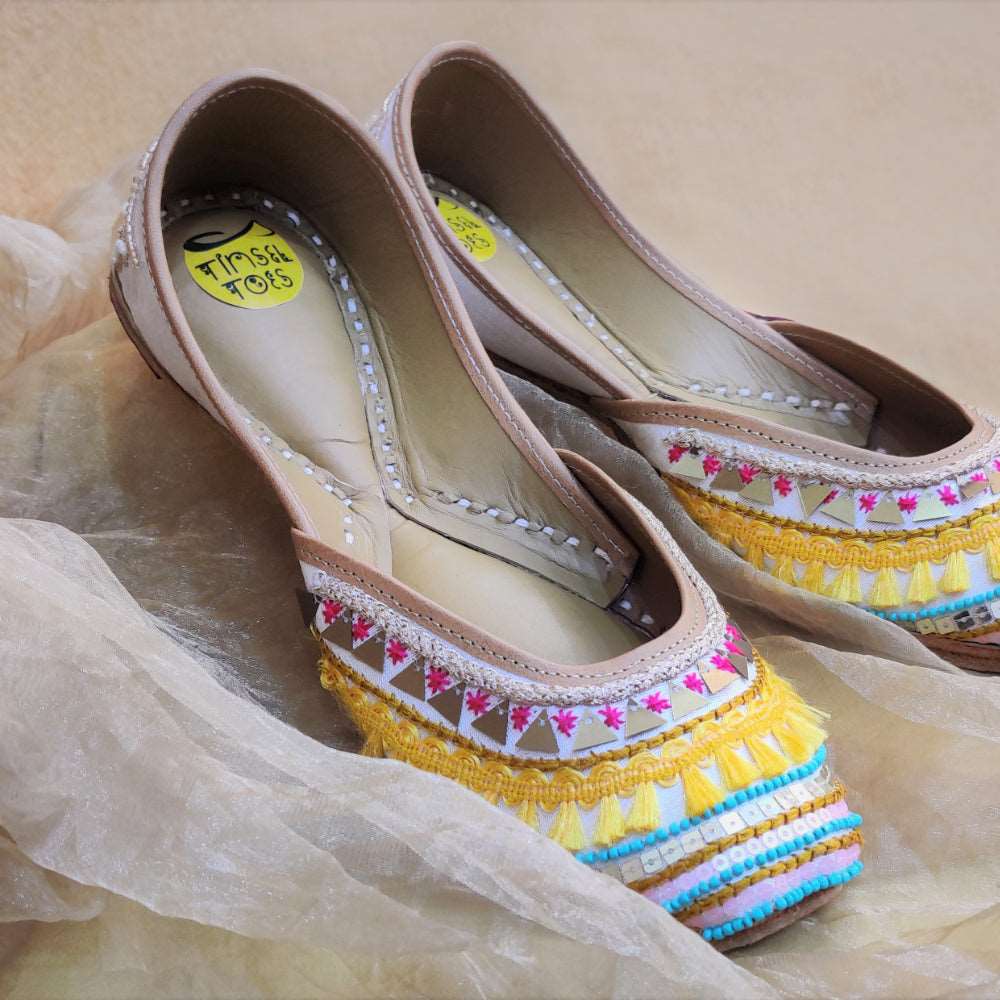 The gorgeous pastel colour palette with a highlighted yellow thread work, our Aria yellow Juttis will give you an ultimate standout look. These comfortable juttis make for an exquisite ethnic and casual pair.