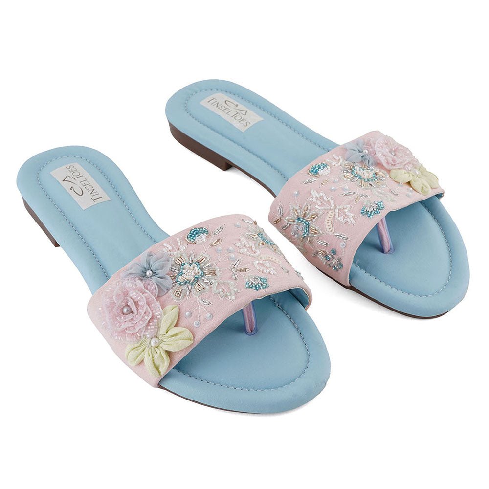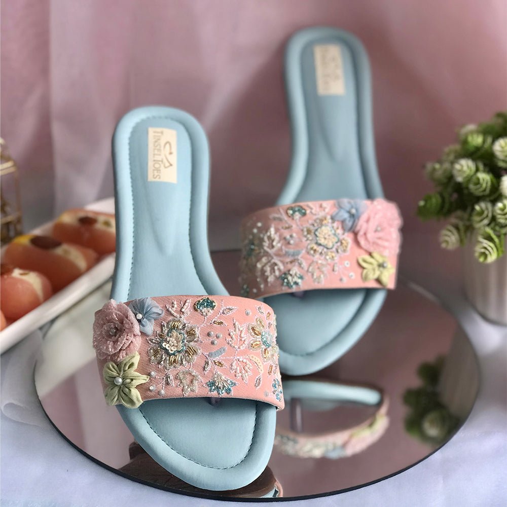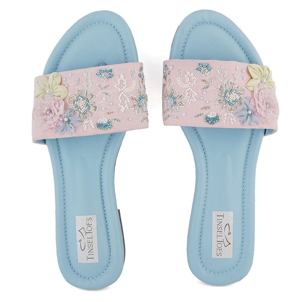 Like a dreamy pink sky engulfed in clear blue clouds, our Sky is Pink sliders have been our in-house favourite design since its conceptualisation. Its soft pink base, with an organza flower work is so intricate and elegant that it makes this just the right pair to oomph up any outfit.