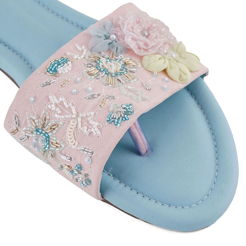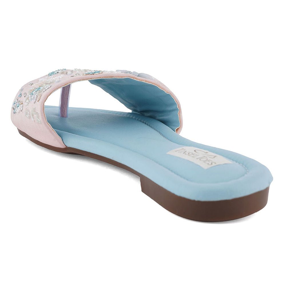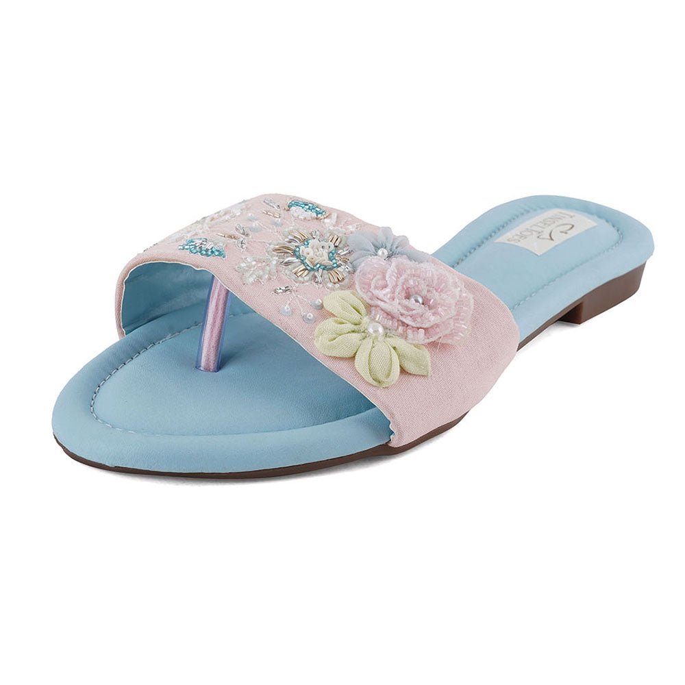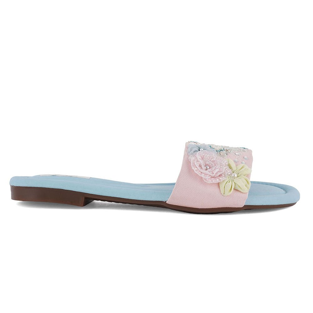 Like a dreamy pink sky engulfed in clear blue clouds, our Sky is Pink sliders have been our in-house favourite design since its conceptualisation. Its soft pink base, with an organza flower work is so intricate and elegant that it makes this just the right pair to oomph up any outfit.